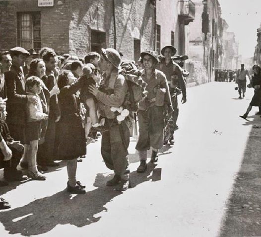 British soldiers having just marched past the house, Via Carlo Mayr 157, fronted with rubble where Michelangelo Antonioni had been born