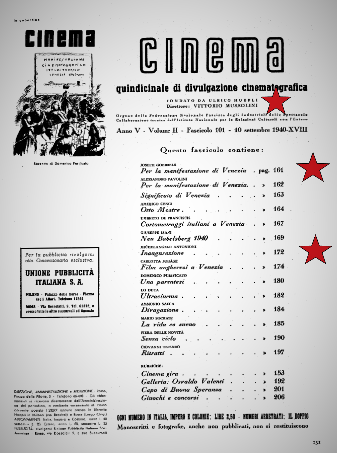 In the very same issue of Cinema, 10 September 1940, the first “article”--written side-by-side in both Italian and German--was by none other than Joseph Goebbels, Reichsminister of Propaganda and Public Enlightenment for the Third Reich. Thus, on the index page of the main fascist journal of cinema of Italy, the name “Goebbels” (as well as “Vittorio Mussolini”) were separated from that of “Antonioni” by scant centimeters, a remarkable linkage of guilt by association, prima facie evidence that Antonioni was an Axis propoganda apparatchik. “Dimmi con chi vai e ti dirò chi sei.” / “Tell me with whom you associate and I will tell you who you are.” I am unaware of any other direct associations between Goebbels and Antonioni other than the fact that both men were at an obvious minimum regarded as nominal fascists, and that as contributors to Cinema it was unnecessary to query them if they supported the eventual triumph of the Axis powers in order to achieve dominion over the entire world. (Both also shared a gait marked by a limp of the right lower extremity. In Goebbels’ case this was caused by a congenital foot deformity; in the case of Antonioni, the gait abnormality was precipitated by a severe stroke that Antonioni suffered in later life.)