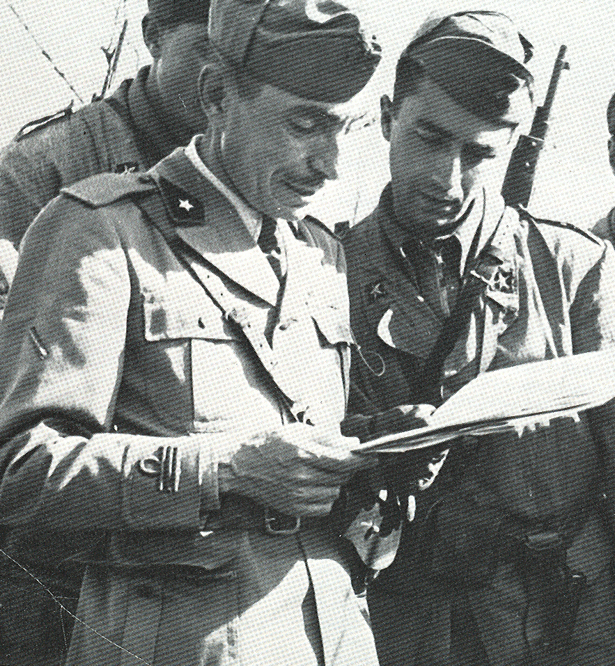 For more regarding (what is) the matter, see: (1) The New York Times on-line article concerning the 2008 documentary, Harlan - Im Schatten von Jud Süss at: http://movies.nytimes.com/2010/03/03/movies/03harlan.html accessed 5 March 2010; (2) IMDB concerning the not yet released 2010 film, Jud Süss: Film ohne Gewissen at: http://www.imdb.com/title/tt1399655/ accessed 5 March 2010; (3) IMDB concerning the original 1940 film, Jud Süß, at: http://www.imdb.com/title/tt0032653/news#ni1602347 accessed 5 March 2010; (4) Wikipedia Italia (In Italian) http://it.wikipedia.org/wiki/Gruppo_Universitario_Fascista regarding Antonioni’s voluntary membership in the “Guf,” and the special commendation he received of “Littoriali Fascisti”; accessed 9 March 2010; (5) Endnote #17 of this book in which I cite Lucretius, who Antonioni considered “one of the greatest poets who ever lived,” and who Antonioni was fond of quoting (Arrowsmith, Antonioni, the Poet of Images; p. 181): “Nothing appears as it should in a world where nothing is certain. The only thing certain is the existence of a secret violence that makes everything uncertain.”] Photo from Biarese and Tassone, i film di Michelangelo Antonioni (Antonioni on right, bayonet at hand in scabbard attached to belt).