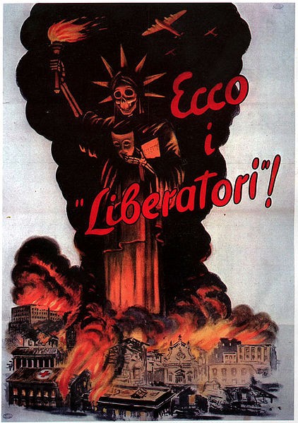 Italian fascist propaganda poster regarding Allied bombings of Italy (“Here are the Liberators”)