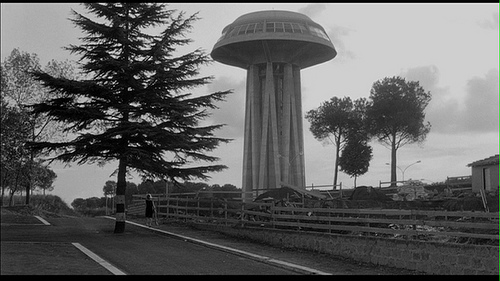 As the curtain in Riccardo’s apartment is drawn and the “Fungo” revealed, the structure appears other-worldly. Indeed, unless one is familiar with the Eur, a reasonable question that arises upon first seeing the water tower is, “What the hell is that?” Furthermore, in later shots of the tower, Antonioni gives us no further information that allows us to clarify its identity.